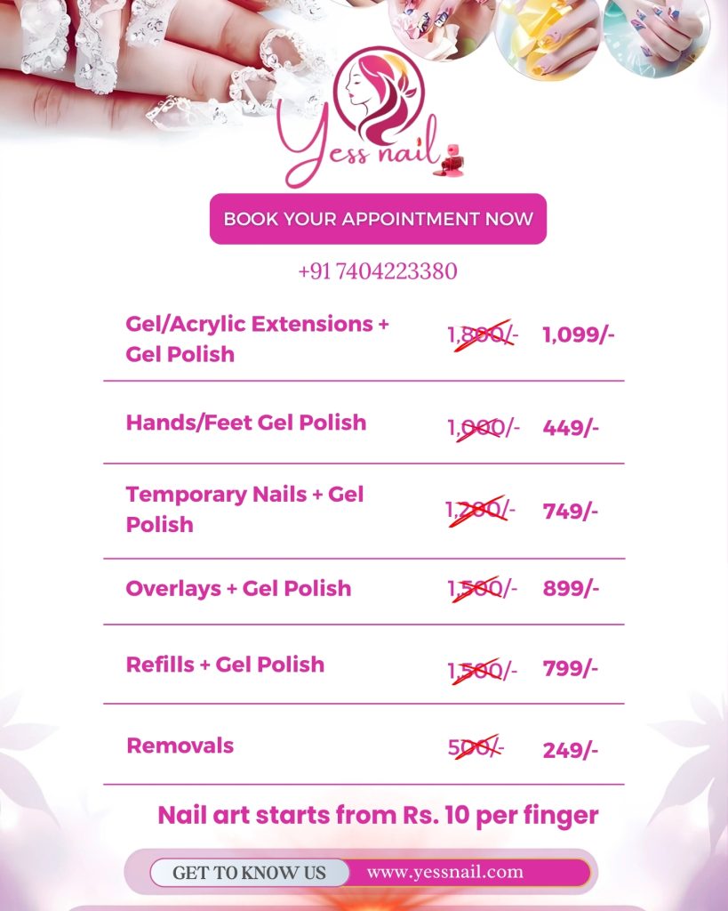 Yess Nail Studio in Ambala is a place where clients enjoy professional manicures, pedicures, and nail art services. We offers relaxation, beauty care, and stylish designs for healthy, polished nails.